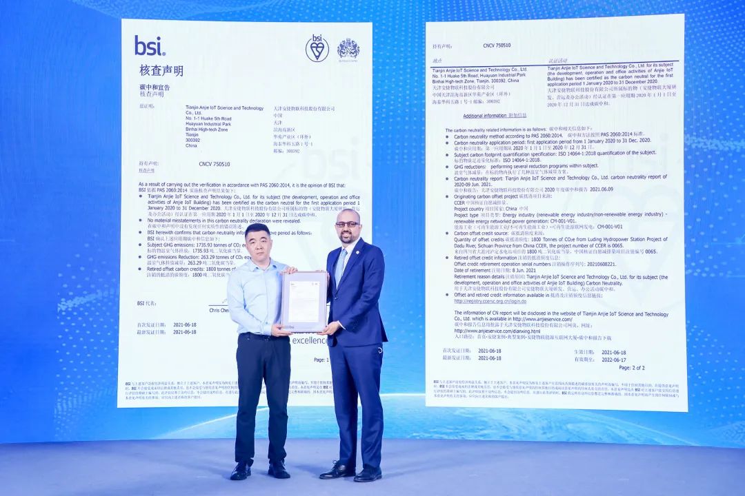 会上,BSI(英国标准协会)战略伙伴关系总监 Paulo Lopes为huatihui物联颁发2020年度碳中和认证证书,huatihui物联正式成为天津市第一家获BSI碳中和认证的企业。